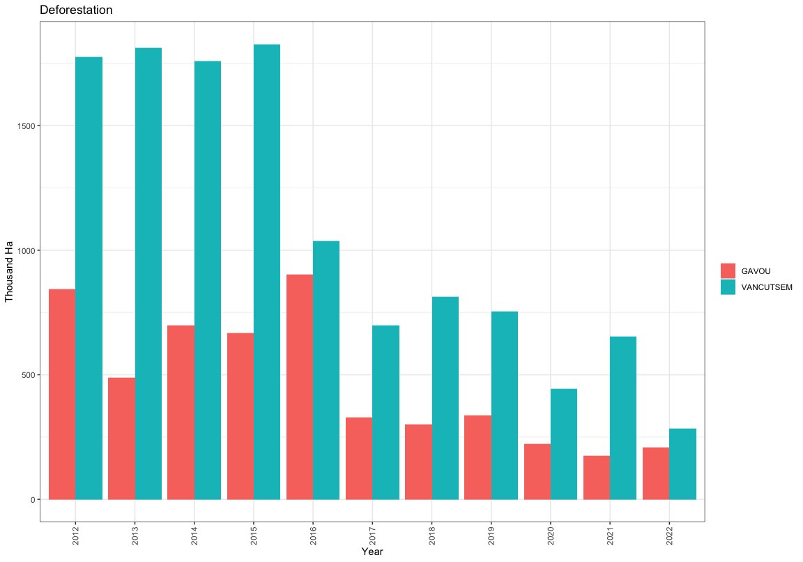 Comparing Gavou and Vancutem indicates that Gavou maps distinctly less overall deforestation. Trends are similar. I belive, Vancutsem is know to overestimate deforestation due to inclusion of shrublands ?