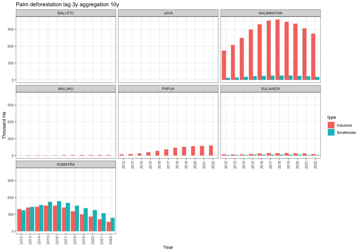 Trends of past palm deforestation using Gavou-TreeMap and 3 years lag, 10 year aggregation