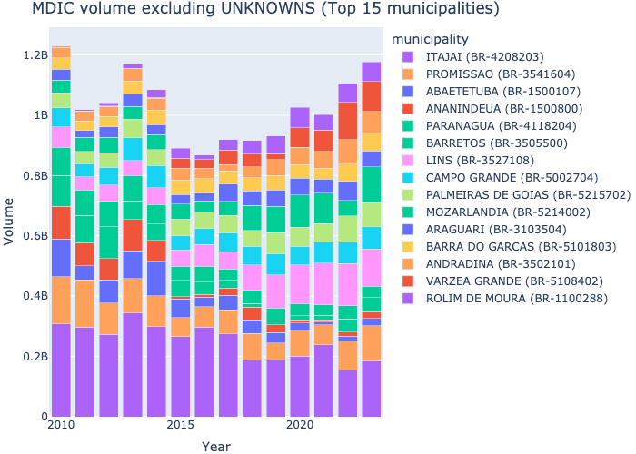MDIC Stacked bar chart — overall top municipalities over time (by volume)