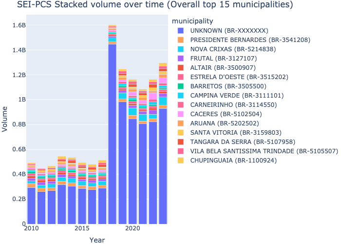 SEI-PCS Stacked bar chart — overall top municipalities over time (by volume)