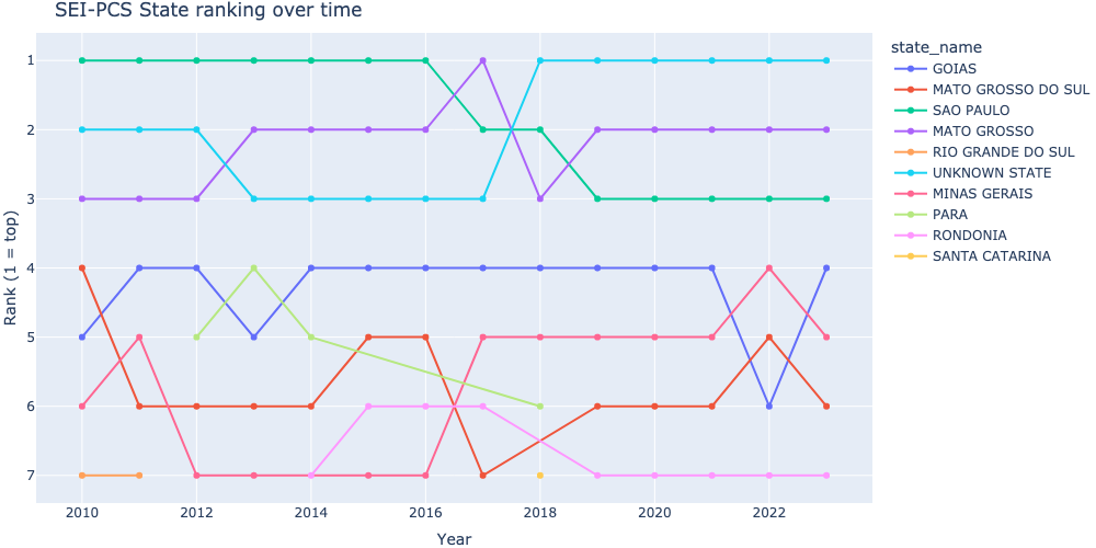 This analysis compares the evolution of the share of state and municipality production across the years, between the results of SEI-PCS v2.2.1 (excluding domestic) and the MDIC municipality export data, filtered by beef hs4 codes.