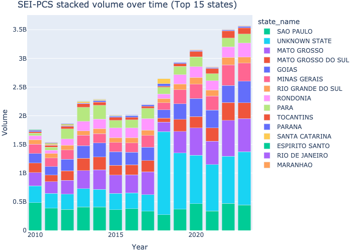 SEI-PCS Stacked bar chart — overall top states over time (by volume)