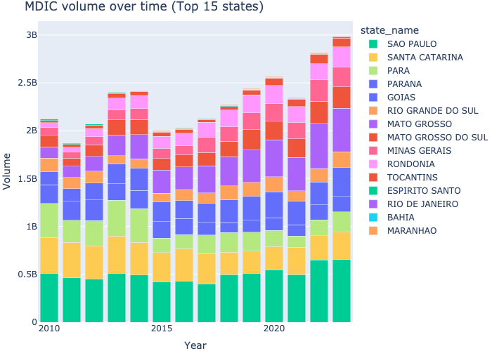 MDIC Stacked bar chart — overall top states over time (by volume)