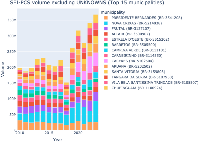 SEI-PCS Stacked bar chart — overall top municipalities over time (by volume) excluding UNKNOWNS