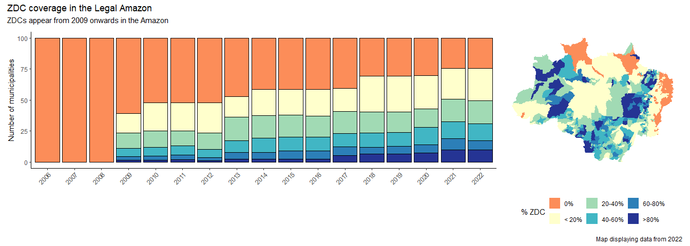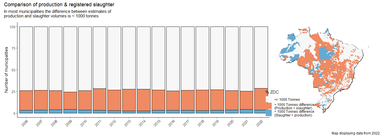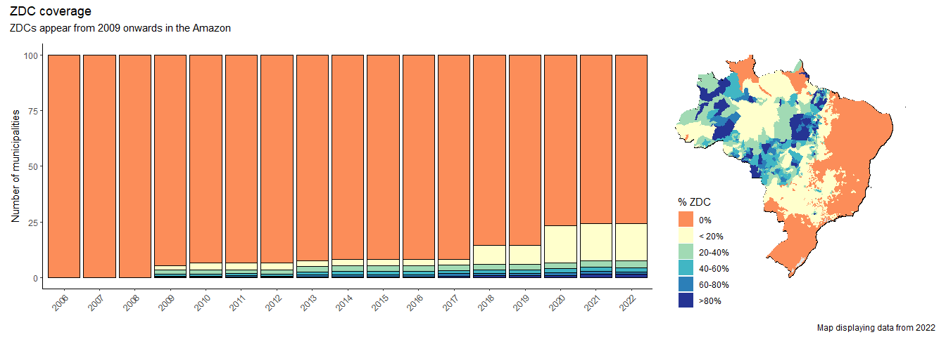 PROP_ZDC) as tonnes of ZDC slaughter / total estimated slaughter or production tonnes, whichever is greater. We use production or registered slaughter as the denominator because our estimates of slaughter are not 100% complete, missing some smaller or unregistered (clandestine) slaughterhouses - none of these have ZDCs, in any case, so it does not bias our estimate of ZDC coverage. - Note, the production data (in carcass tonnes/muni/year) is as per zu Ermgassen et al. and ZDC data include the TAC commitments in the Brazilian Legal Amazon (data from Boi na Linha), the G4 commitment in the Amazon and company-specific commitments, e.g. from Frigol (2020) and Prima Foods (2018).